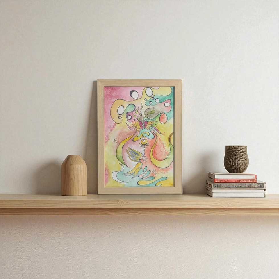Douce Évasion est une peinture abstraite délicate et poétique, réalisée sur papier et présentée dans un cadre en bois clair. Les formes organiques et fluides se mêlent dans des tons pastel — rose, jaune, bleu et vert — créant une atmosphère douce et apaisante.