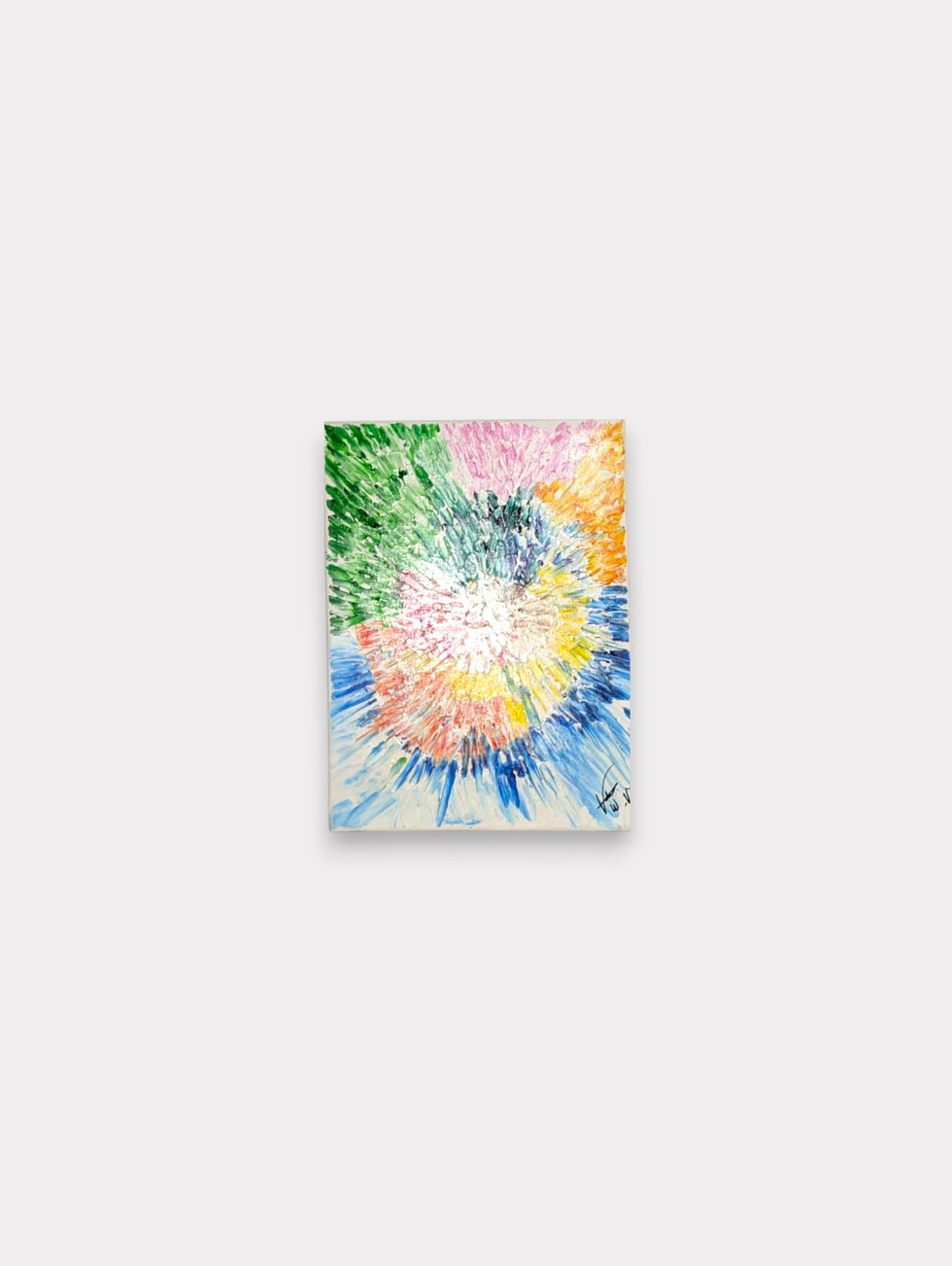 Explosion de Couleurs est une peinture abstraite pleine d’énergie et de vitalité. Les teintes vives — vert, rose, jaune, bleu et orange — jaillissent depuis un centre lumineux, créant un effet de mouvement et de dynamisme qui attire immédiatement le regard.
