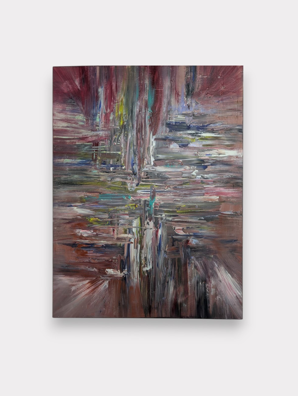 Miroir des Profondeurs est une peinture abstraite qui invite à la réflexion et à l’introspection. Ses teintes profondes de bordeaux, brun et gris se mêlent à des touches lumineuses de jaune et de vert, créant un contraste saisissant qui évoque un paysage urbain ou un reflet aquatique.