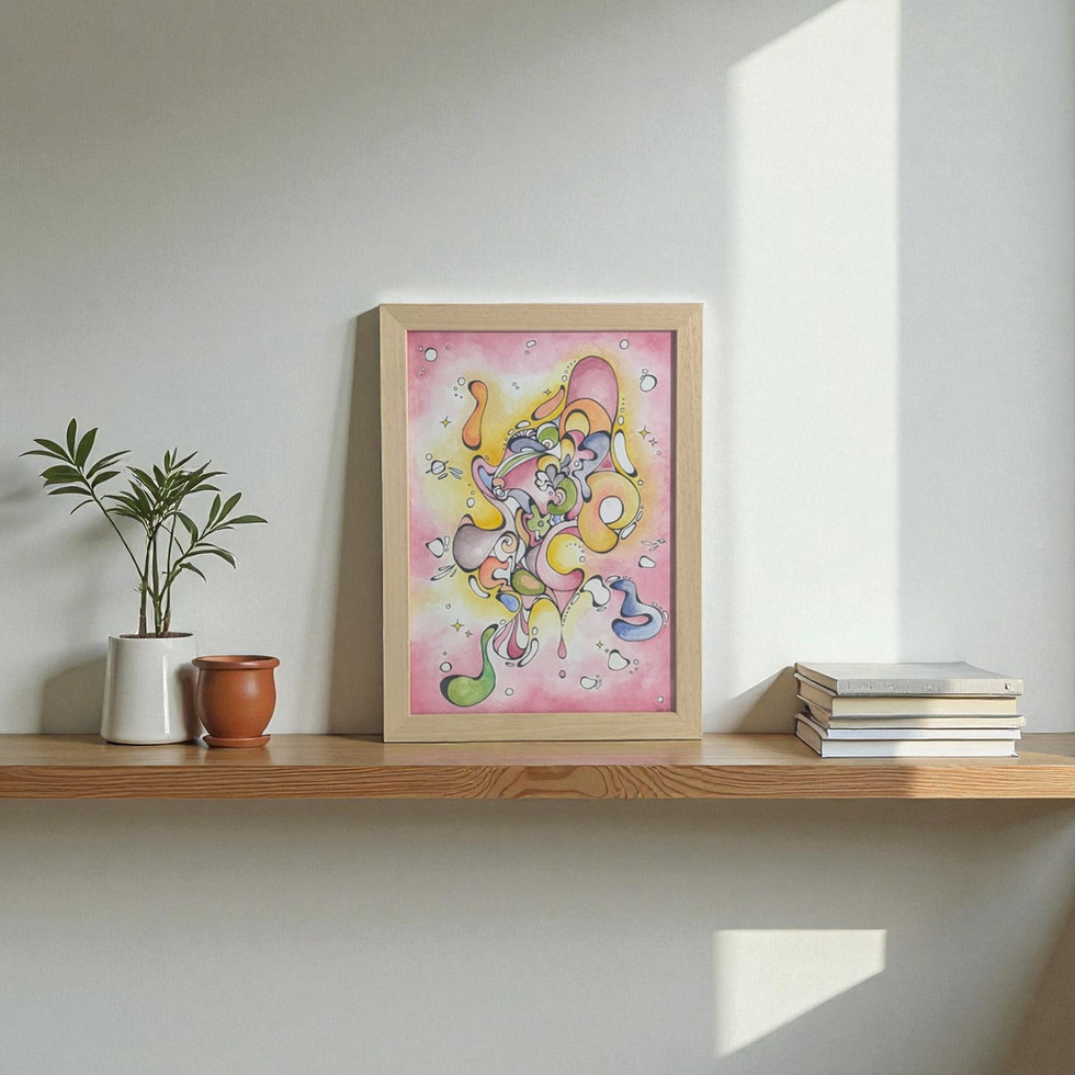 Des formes souples s’enroulent au centre, comme suspendues dans une lumière douce. Les couleurs — rose, jaune, vert et bleu — se fondent avec légèreté, créant un effet à la fois vivant et apaisant. Les contours noirs structurent l’ensemble sans briser sa fluidité.